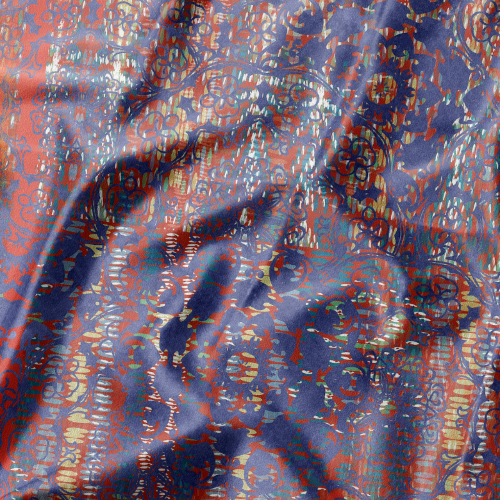 The beautiful vintage printed scarf is inspired by traditional ikat motifs and other hand-painted fabrics unique to Central Asia, prominent in the silk kaleens at the time. Rich moody vibrant blues and coral strike a perfect balance giving a luxurious body to the art.